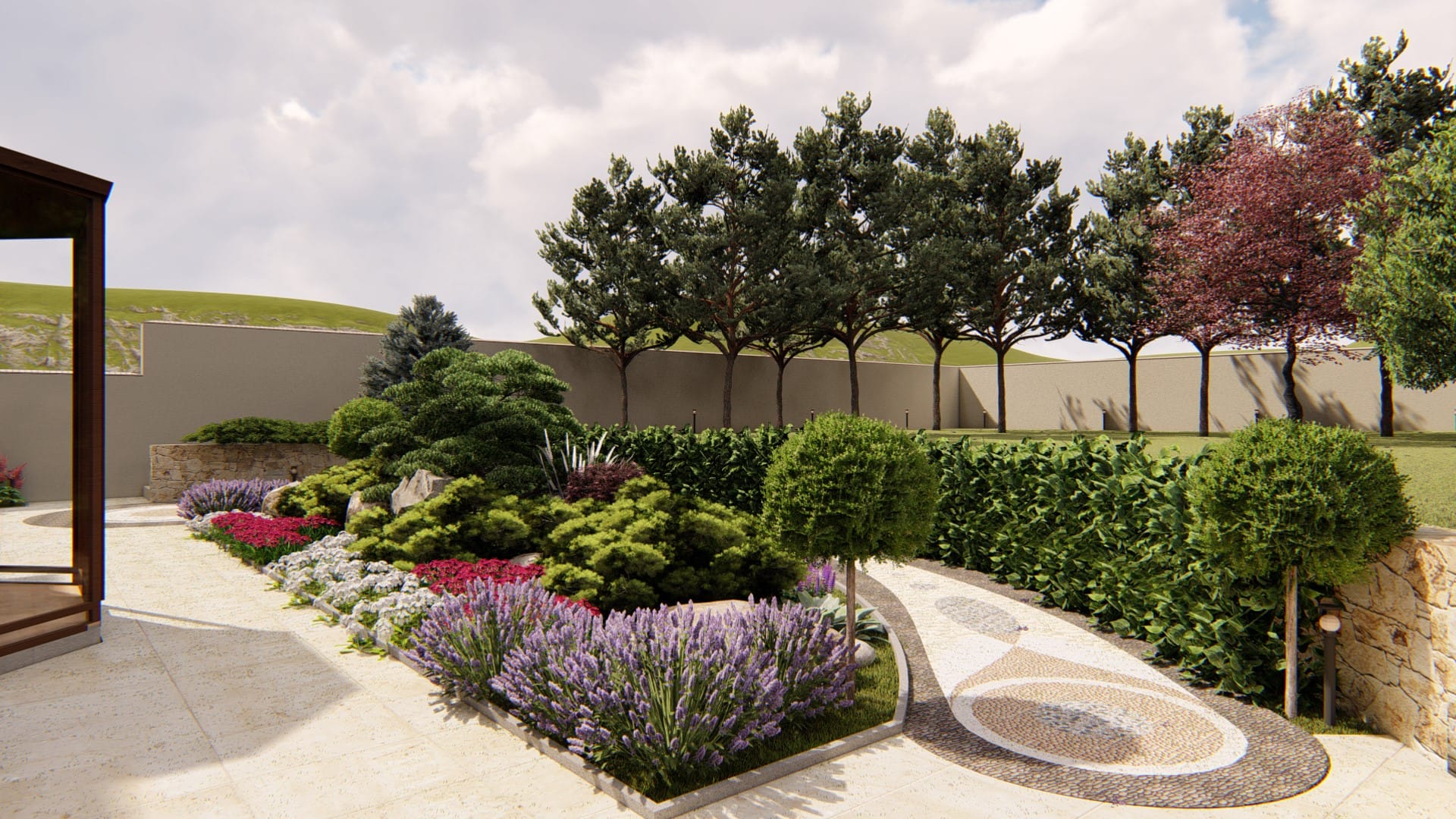 - Выбор материалов для дорожек, террас, подпорных стенок и других элементов. Убедитесь, что выбранные материалы хорошо сочетаются друг с другом и с окружающей средой.
