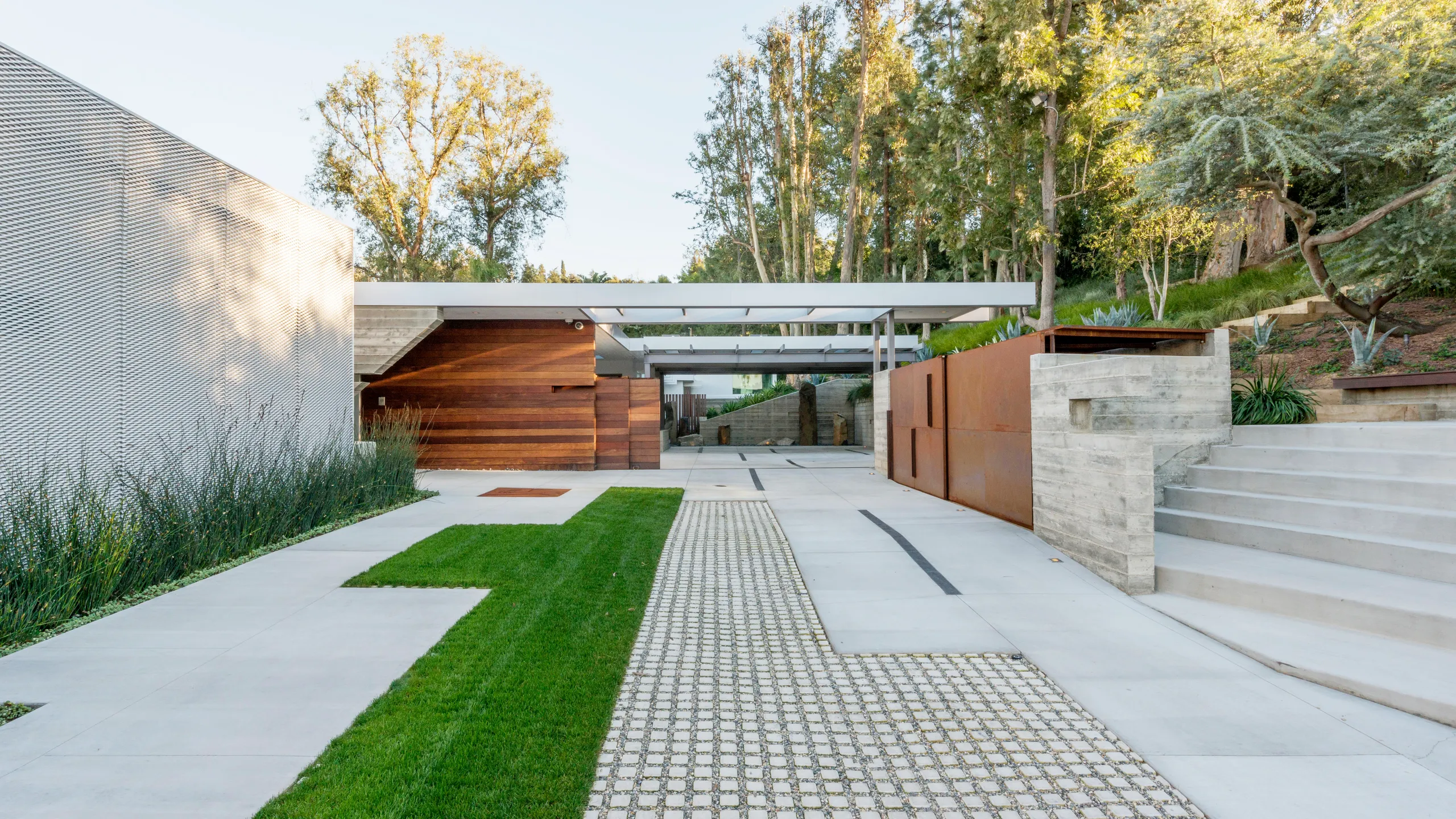 - Геометричность – один из главных инструментов минимализма. Прямые линии, четкие углы, простые геометрические фигуры придают пространству ощущение порядка и организованности. Здесь часто можно увидеть прямоугольные газоны, квадратные террасы, дорожки из плит правильной формы.