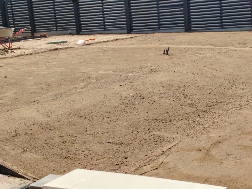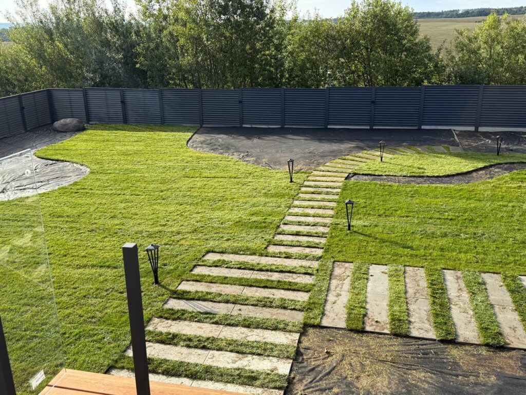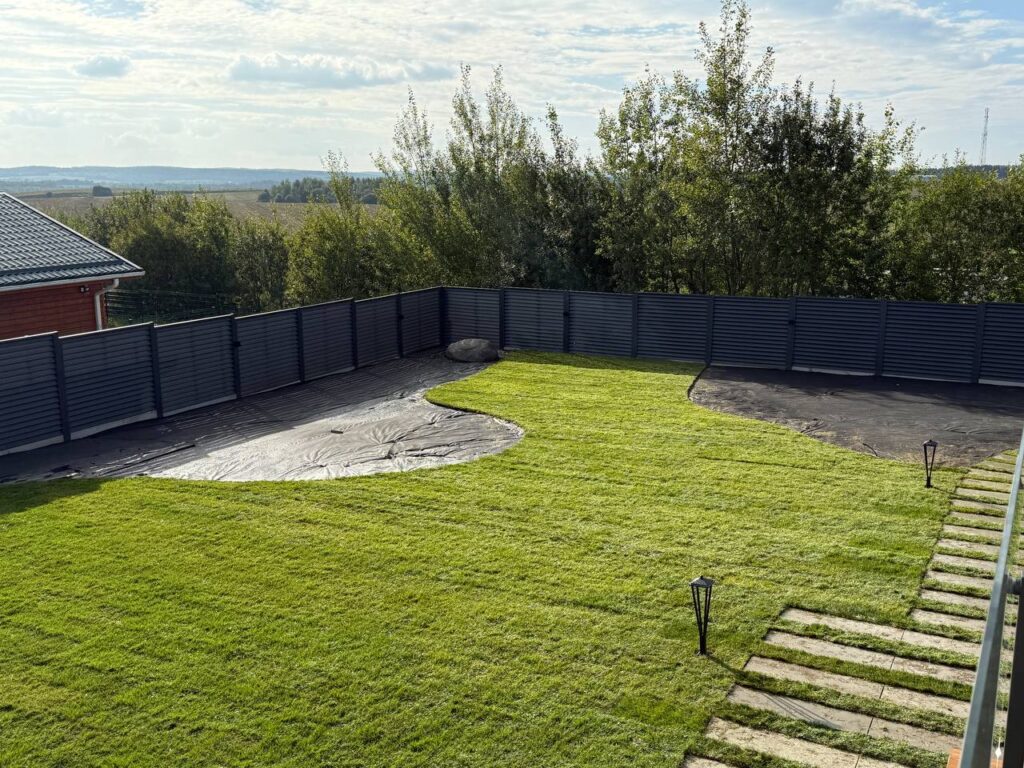 Задача: устройство рулонного газона на всей территории, замена грунта, устройство кротовой сетки и автоматической системы полива.